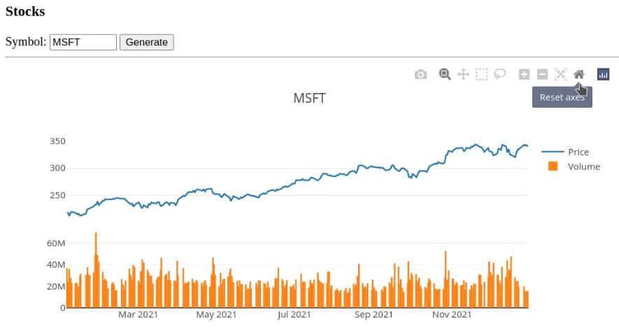 Listing 8 shows the JavaScript code. On line 01, we define a function to update the chart. On line 02, we get the symbol name from the HTML input. On line 03, we call our server to get the data and on line 04, we parse the JSON. Finally on line 05, we use plotly to generate a new chart.